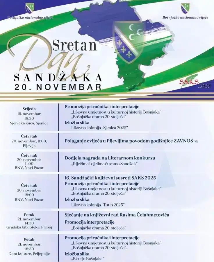 Bošnjačko nacionalno vijeće organizuje niz kulturnih i svečanih aktivnosti povodom Dana Sandžaka, koje će biti realizovane u Sjenici, Pljevljima, Novom Pazaru, Priboju i Prijepolju.