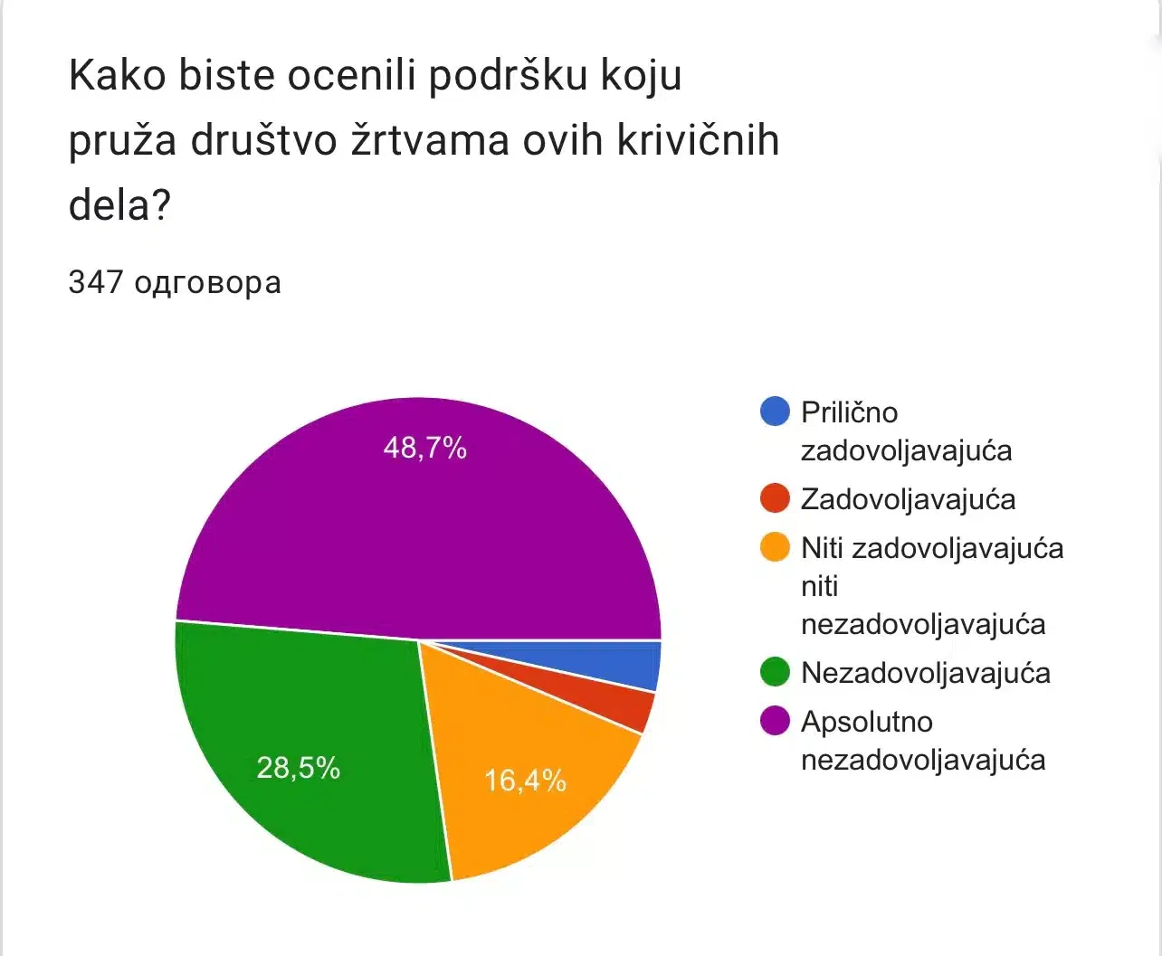 Kako ocenjuju podršku koju pruža društvo žrtvama ovih krivičnih dela, 77.2% ispitanika podršku opisuju kao nezadovoljavajuću i apsolutno nezadovoljavajuću. 16.4% podršku društva opisuje kao ni zadovoljavajuću i ni nezadovoljavajuću, dok njih 6.4% smatraju podršku društva zadovoljavajućom.