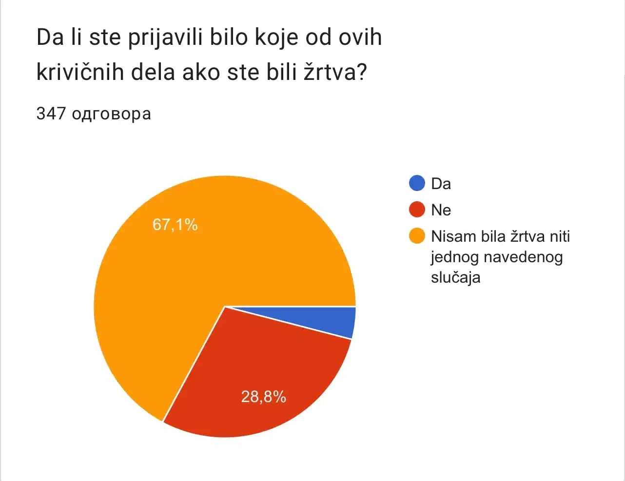 Na pitanje da li su ukoliko su bili žrtve bilo kojih od ovih navedenih krivičnih dela prijavili slučaj nadležnima samo 4% ispitanika je odgovorilo sa DA, dok njih 28.8% ispitanika koji su se izjasnili kao žrtve ovih krivičnih dela NISU prijavili ova krivična dela prema dobijenim odgovorima razlozi su strah, osuđivanje društva, sram, gađenje i straha kojeg imaju od počinioca tog dela.