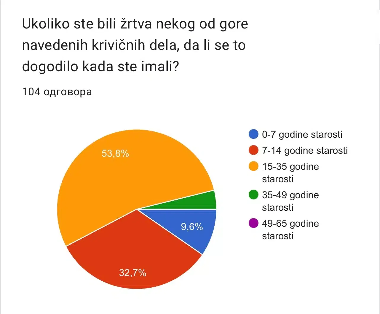 53.8 % njih koji su bili žrtve nekih od navedenih oblika seksualnog nasilja su bili u tom trenutku starosne dobi između 15 i 35 godina, njih 32.7% su bili starosti između 7 i 14 godine života. 9.6% ispitanika je u trenutku seksualnog nasilja i uznemiravanja imalo između 0-7 godina a njih 3.8% je bilo starosne dobi između 35-49 godina.