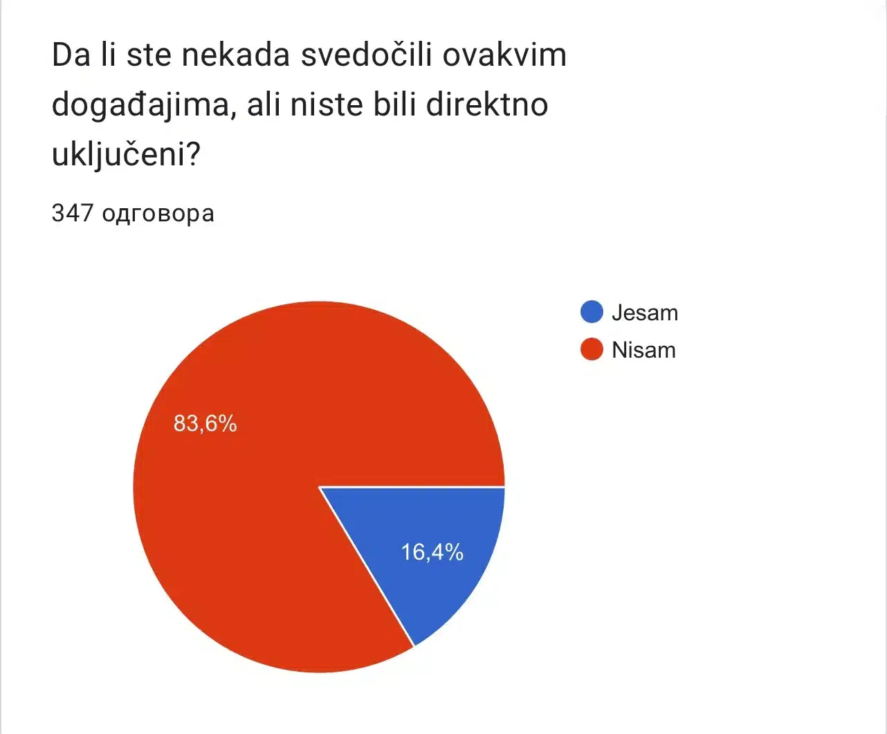 Na pitanje “Da li ste nekada svedočili ovakvim događajima, ali niste bili direktno uključeni?”, 83.6% ispitanika je odgovorilo sa NE, a njih 16.4% odgovorilo je na ovo pitanje sa DA.