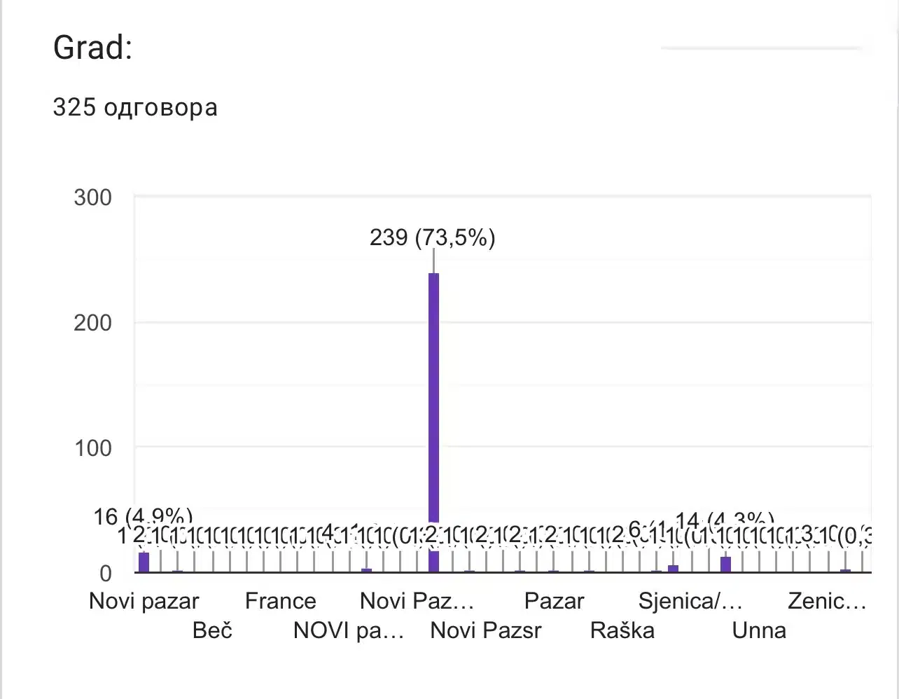 73.5 % ispitanika koji su odgovorili na ovu anketu su sa područja Novog Pazara, u nešto manjim procentima imamo i odgovore iz okolnih gradova, Sjenice, Raške, ali i Beograda, Zaječara, Zenice itd.