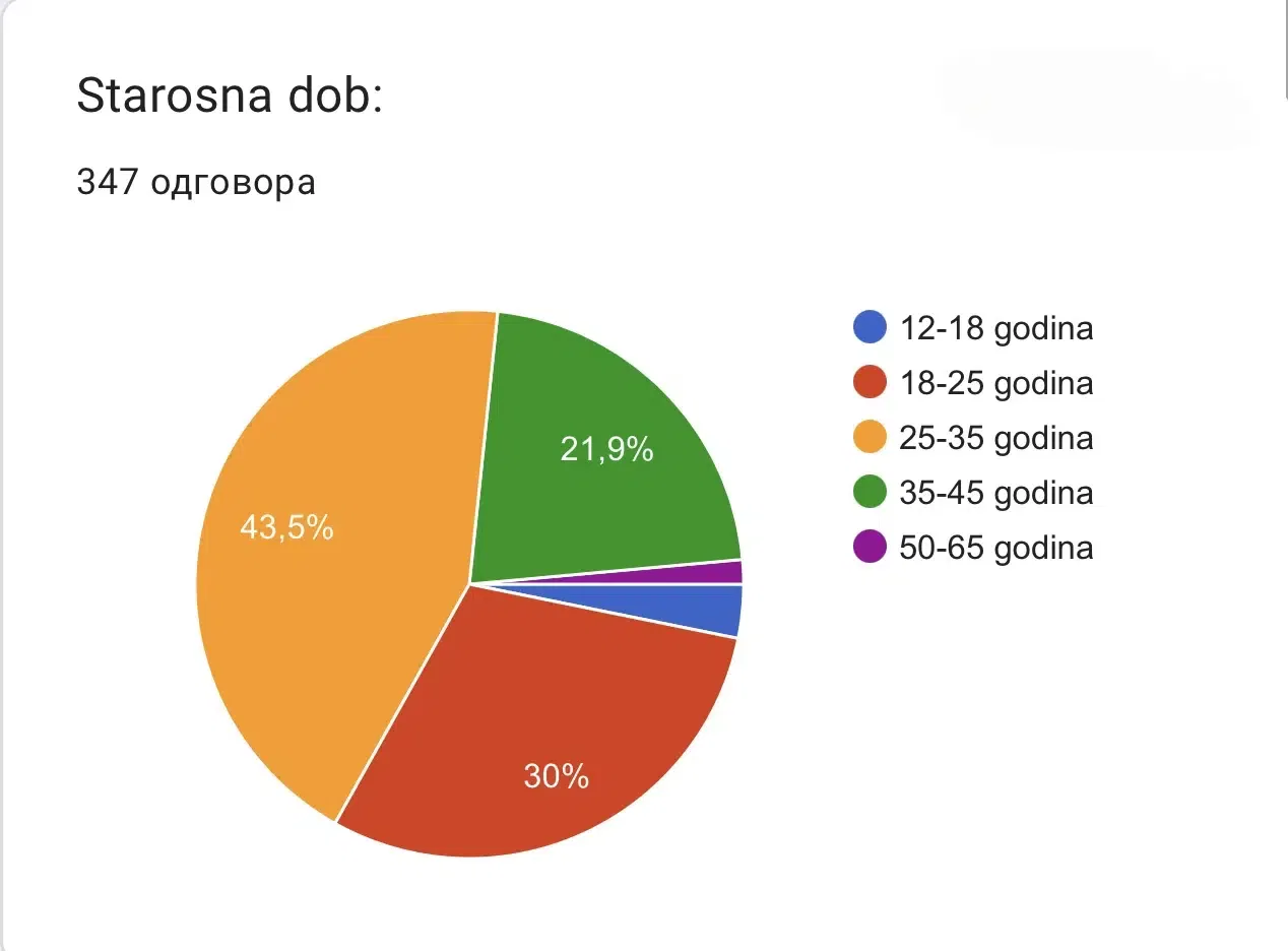 Najveći broj odgovora dolazi od populacije između 25 i 35 godina, što čini 43.5% ukupnih odgovora u anketi. Osobe u dobi od 18 do 25 godina daju 30% odgovora, dok odgovori osoba između 35 i 45 godina čine 21.9%. Maloletnici između 12 i 18 godina čine 3.2% odgovora, dok lica između 50 i 65 godina doprinose s 1.4% odgovora.