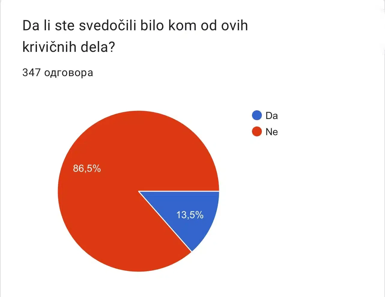 Na pitanje da li su svedočili bilo kom od ovih krivičnih dela njih 13.5% odgovorilo je sa DA, dok je njih 86.5% ispitanika na ovo pitanje odgovorilo sa NE.