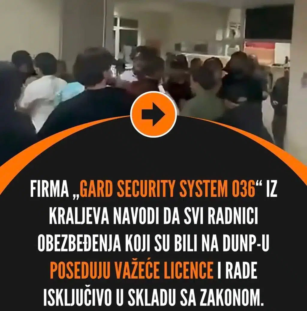 Kraljevska firma Gard Security System 036 u zvaničnom saopštenju navodi da su svi radnici obezbeđenja angažovani na Državnom univerzitetu u Novom Pazaru (DUNP) posedovali važeće licence i da su postupali isključivo u skladu sa zakonom.