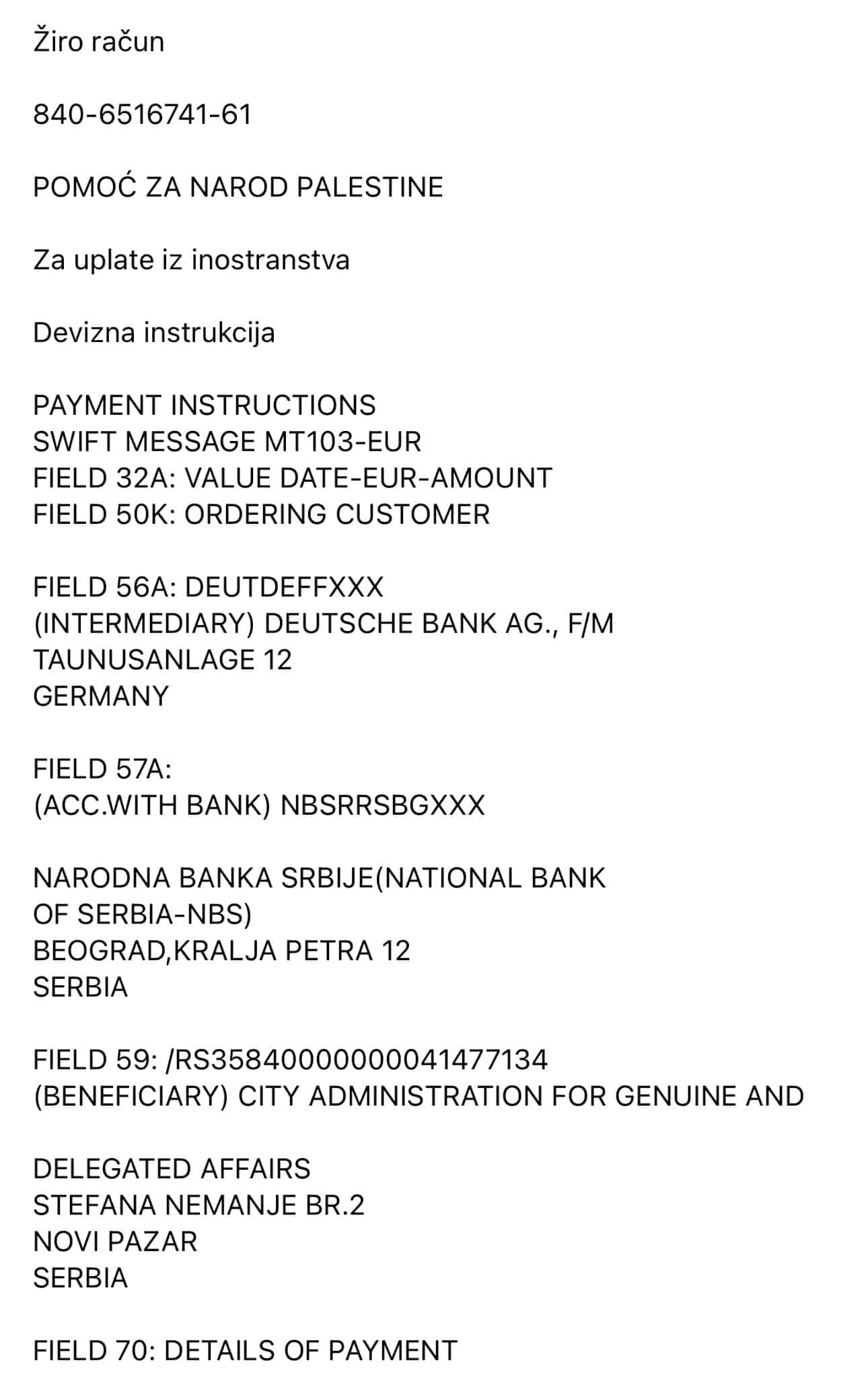 Žiro račun je 840-6516741-61, a svrha uplate – pomoć za narod Palestine.