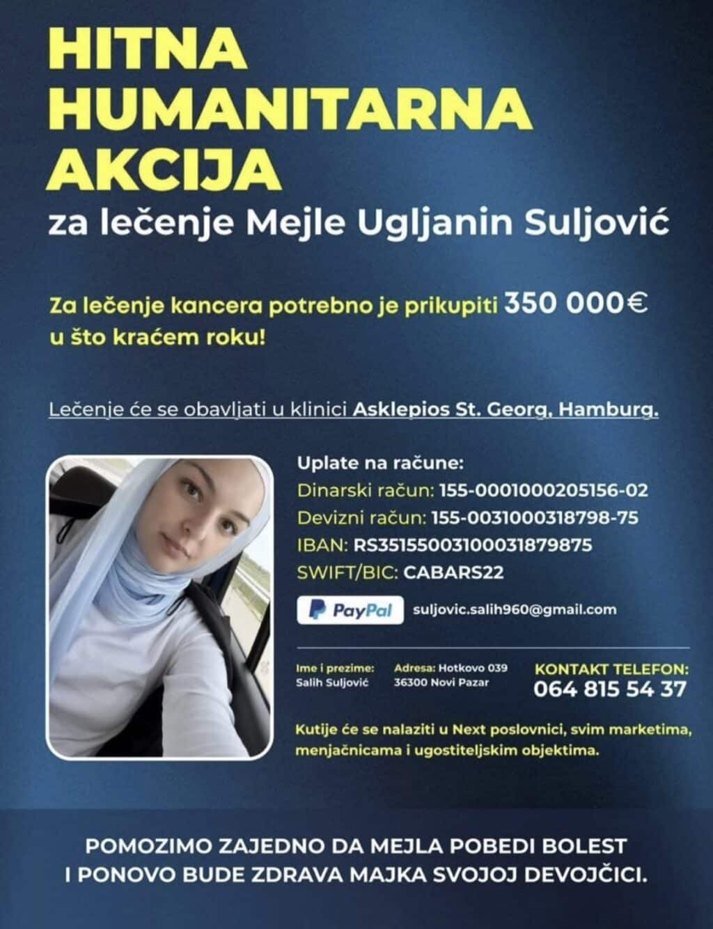 Naša sugrađanka, Mejla Ugljanin Suljović, suočava se sa teškom bolešću i potrebna joj je naša podrška kako bi započela lečenje kancera u klinici Asklepios St. Georg u Hamburgu. Da bi dobila šansu za izlečenje, neophodno je prikupiti 350.000 evra u što kraćem roku.