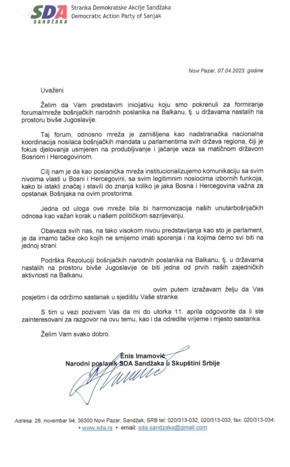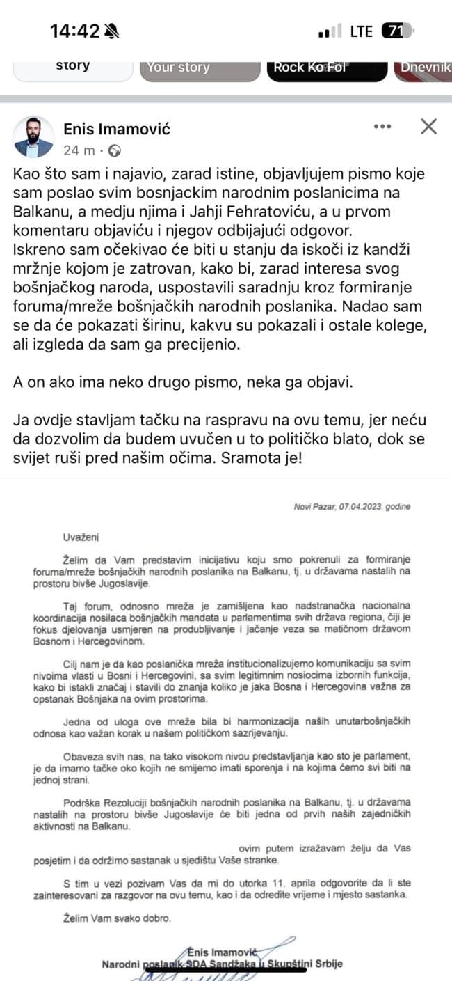 Nakon sinoćnog gostovanja narodnog poslanika, Jahje Fehratovića u emisiji “Posmatranje” portala A1 i njegove izjave da je od Imamovića u martu ove godine dobio pismo od Enisa Imamovića koji u tom trenutku od njega traži sastanak, oglasio se i Imamović putem zvaničnog Fejsbuk profila reagujući na ovu temu.