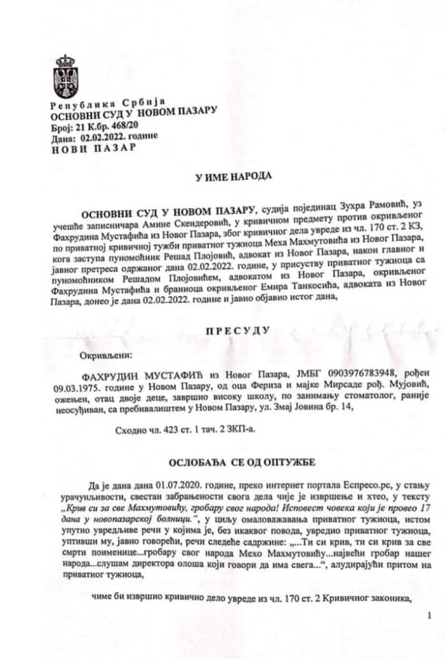 Osnovni sud u Novom Pazaru oslobodio je Fahrudina Mustafića krivične odgovornosti po privatnoj tužbi Meha Mahmutovića, napisao je lekar na svom facebook profilu, a kao dokaz objavio je rešenje presude Osnovnog suda u Novom Pazaru.