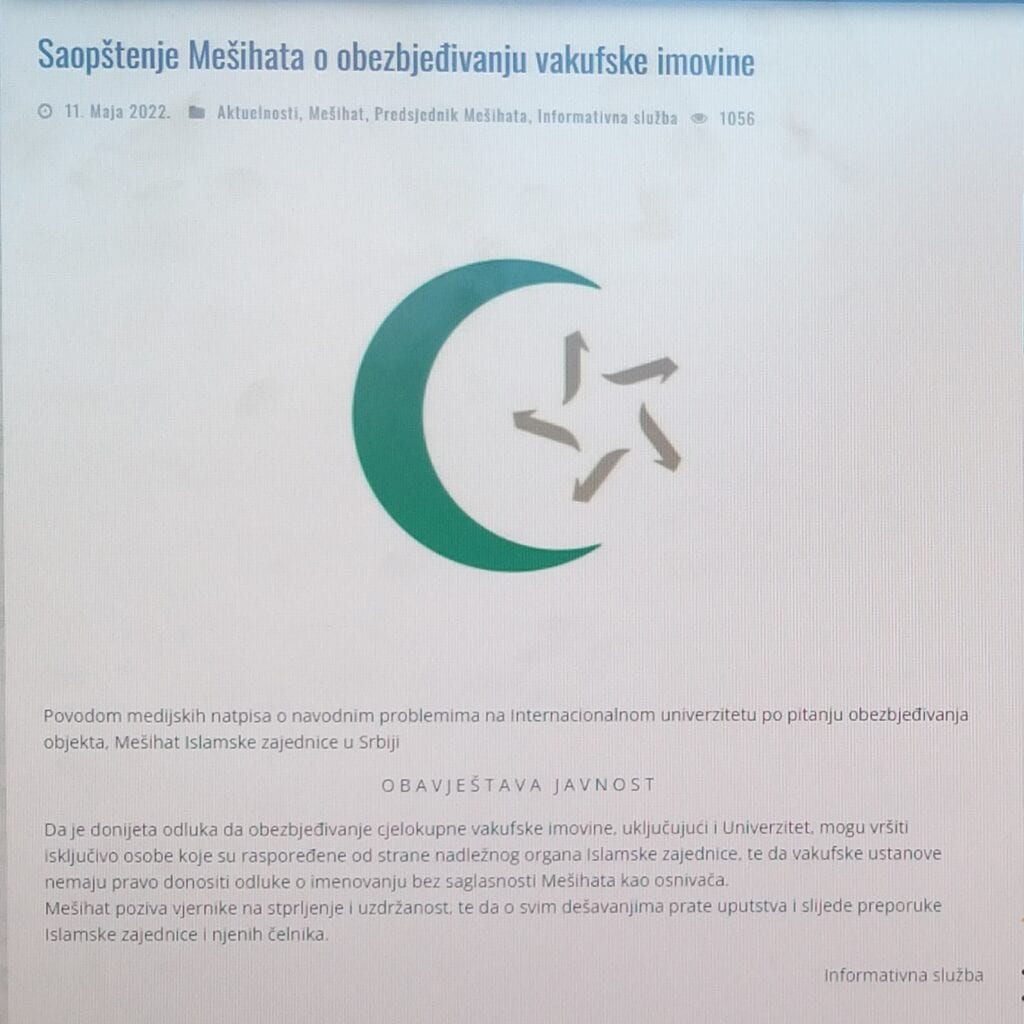 Mešihat Islamske zajednice u Srbiji nakon problema na Intrenacionalnom univerzitetu po pitanju obezbeđivanju objekta dao je obaveštenje za javnost da vakufske ustanove nemaju pravo donositi odluke o imenovanju bez saglasnosti Mešihata kao osnivača.