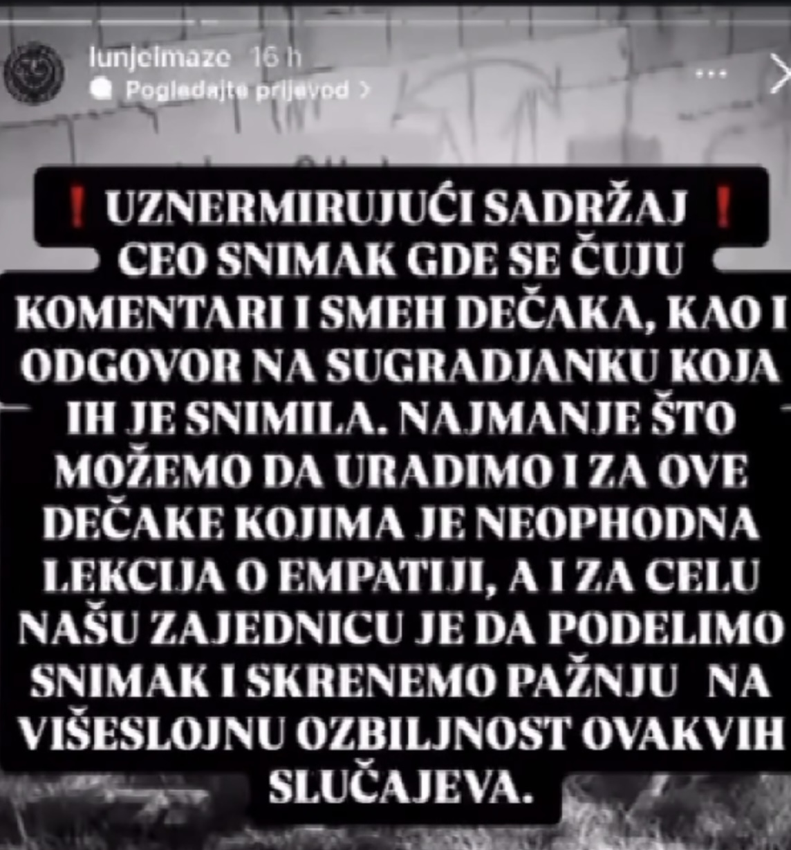 Ona naglašava da je, bez obzira na okolnosti, ponašanje koje se vidi na snimku posebno zabrinjavajuće. „Podsmeh i odsustvo empatije koje vidimo na snimku su veliki problem. Plašim se da takvo ponašanje, ako se ne sankcioniše, može dovesti do mnogo ozbiljnijih problema u budućnosti“, upozorava Čarovac.