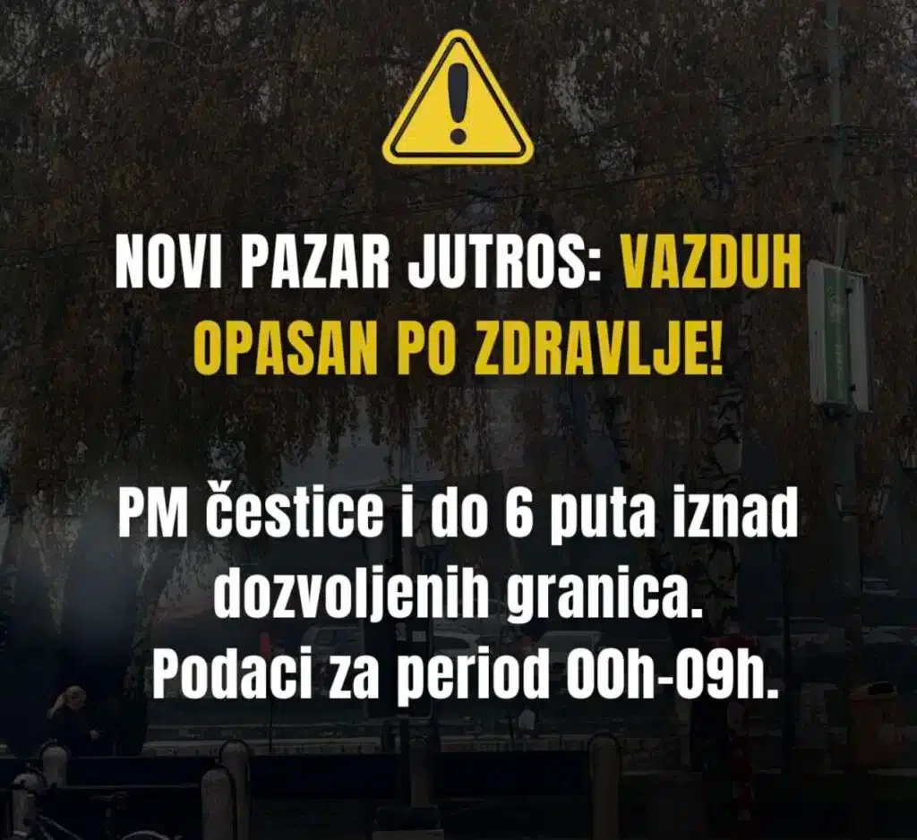 Jutro u Novom Pazaru obeležile su ekstremno visoke koncentracije zagađujućih čestica koje su vazduh učinile opasnim po zdravlje. Podaci merenja u periodu od 00 do 09 časova pokazuju da su vrednosti PM čestica bile daleko iznad evropskih i svetskih standarda.