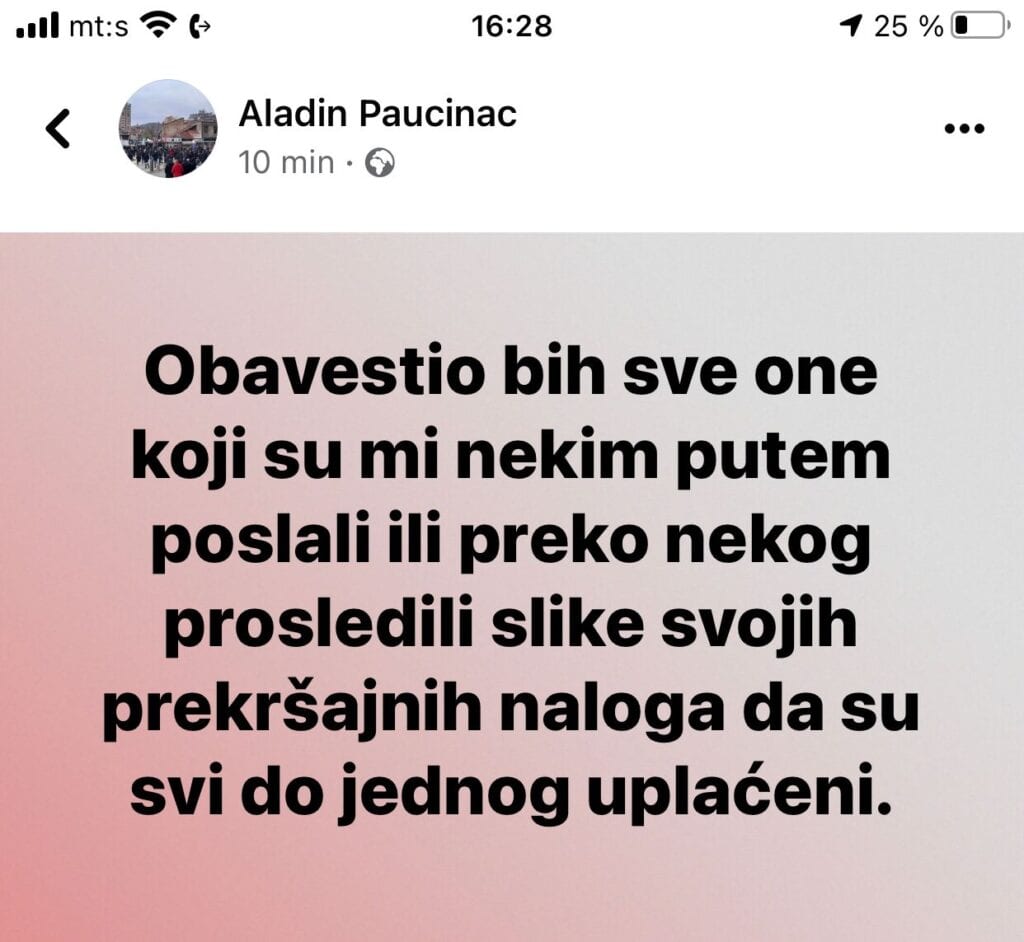 Građani koji su bili na protestu u Novom Pazaru a dobili prekršajne prijave od policije i iste dostavili Novopazarcu Aladinu Paučincu su plaćene naveo je Paučinac na svom Facebook profilu.