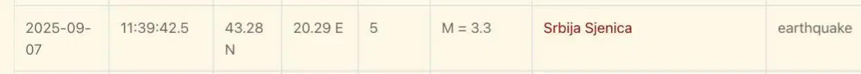 Na području Sjenice danas je registrovan novi zemljotres jačine 3,3 stepena po Rihterovoj skali, saopštio je Republički seizmološki zavod. Potres je zabeležen u 11:39 časova po lokalnom vremenu, na dubini od 5 kilometara.