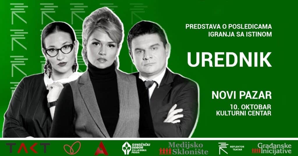 Predstava „Urednik“ koja govori o medijskim manipulacijama, propagandi i beskompromisnom plasiranju lažnih vesti odigrana je u novopazarskom Kulturnom centru. Ova drama prati dinamiku jedne televizijske redakcije i kako se ona, što u kolektivnom što u individualnom obliku, nosi sa time kako i koje će informacije prenositi.
