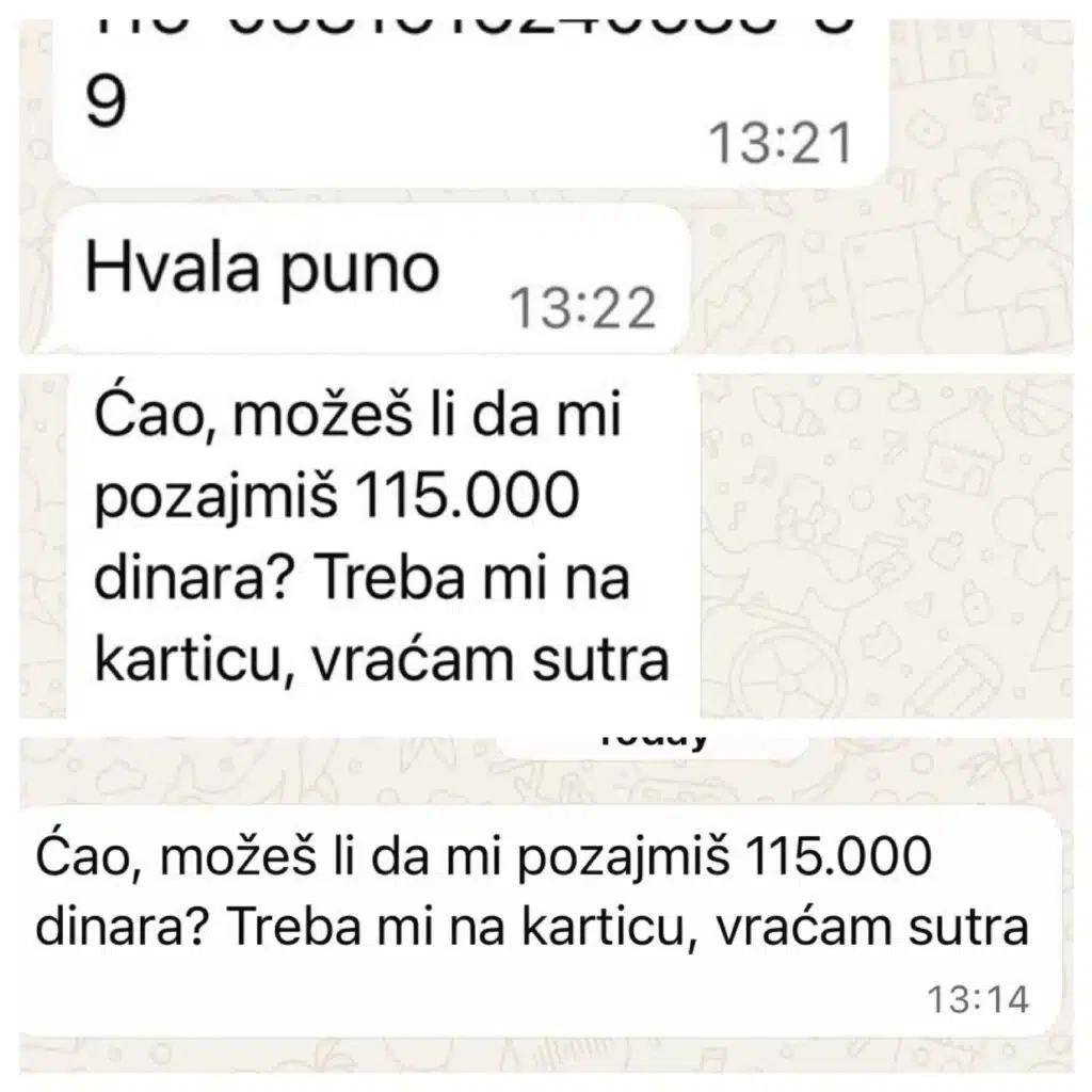 Kako saznajemo, građanima stižu poruke koje izgledaju kao da ih šalju prijatelji, rođaci ili poznanici. U porukama se navodi da je potrebna hitna novčana pomoć, nakon čega se šalju podaci za uplatu – najčešće žiro račun i iznos koji treba uplatiti.