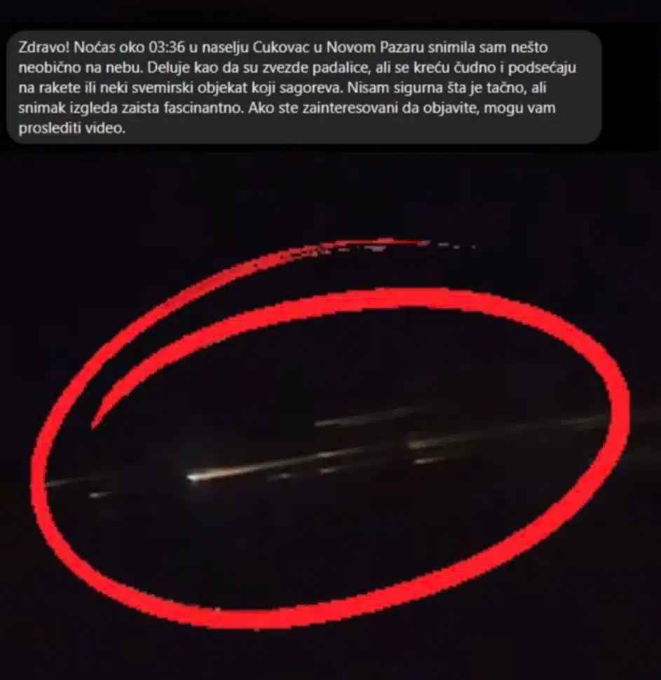 Juče u ranim jutarnjim satima, tačnije oko 03:36, u naselju Ćukovac u Novom Pazaru uočena je neobična svetlosna pojava na nebu. Viđena svetla nalik na zvezde padalice, ali sa neobičnim kretanjem i bojom, što je izazvalo sumnju da su reč o meteoru-raspadu ili sagorevanju svemirskog objekta.