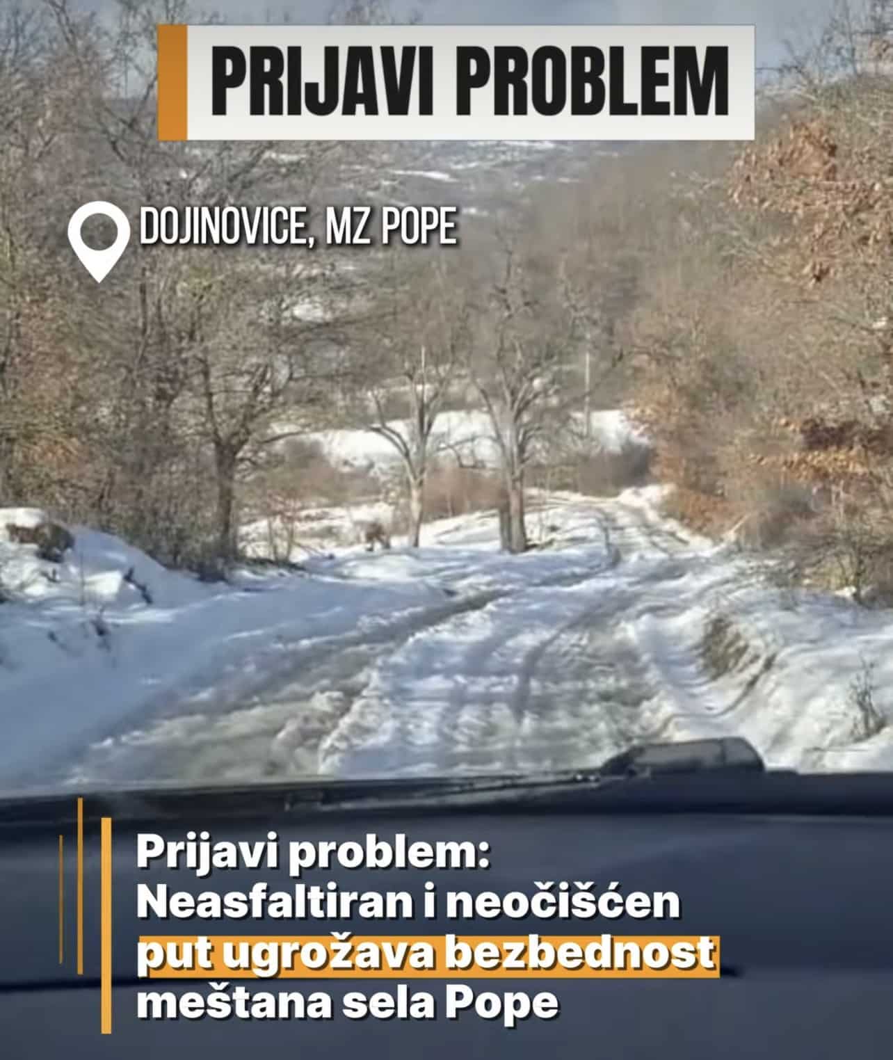 Meštani Dojinovica u mesnoj zajednici Pope poslali su našoj redakciji snimke i fotografije na kojima se vidi da je bezbednost učesnika u saobraćaju ugrožena zbog neasfaltirane ulice, kao i zbog snega i leda koji nisu uklonjeni. Kako navode, kretanje je otežano, posebno za pešake i vozila.