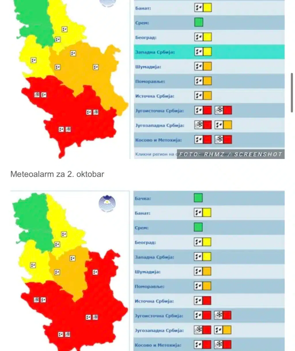 • Žuti meteoalarm zbog kiše: Banat, Beograd, Zapadna Srbija.
