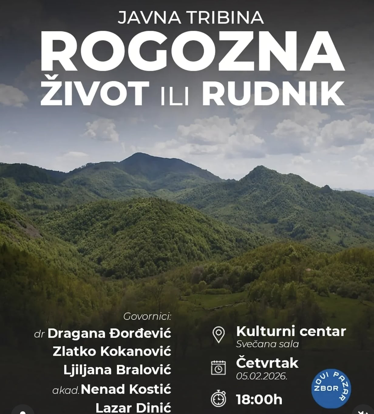 Pitanje potencijalnog rudarenja na Rogozni i njegovih mogućih posledica po zdravlje ljudi, prirodne resurse i budućnost lokalne zajednice biće u fokusu javne tribine „Rogozna – život ili rudnik“, koja će biti održana u svečanoj sali Kulturnog centra u Novom Pazaru.