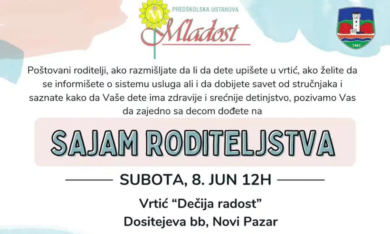 U subotu, 8. juna, u vrtiću „Dečija radost“ u Novom Pazaru, održat će se Sajam roditeljstva. Početak manifestacije je u 12 časova u Ulica Dositejeva br. bb. Cilj sajma je informisanje roditelja o dostupnim uslugama, pružanje saveta stručnjaka, te osiguranje zdravijeg i srećnijeg detinjstva za decu.