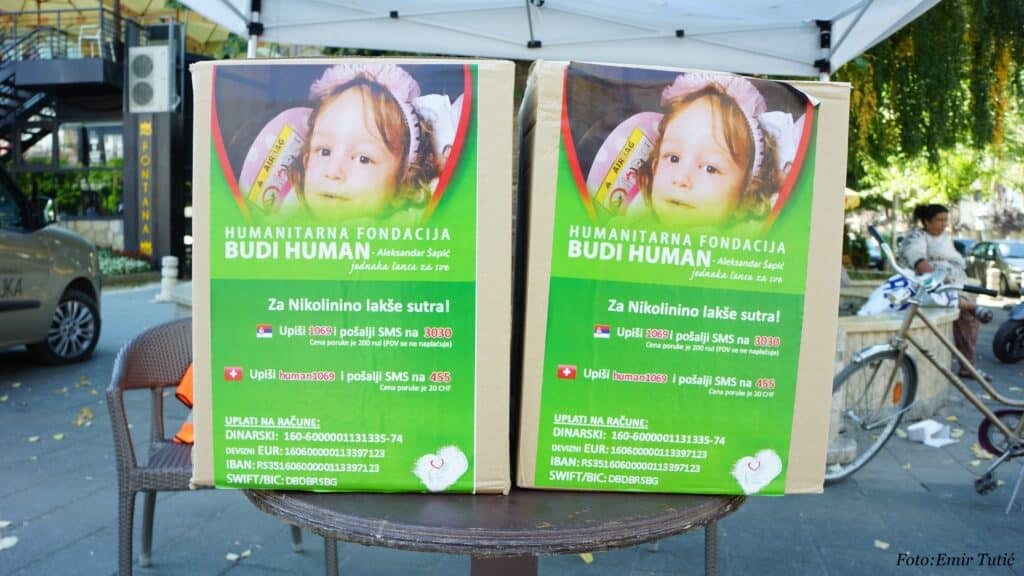 Humanitarna organizacija Sevap i Otvorena ruka, kojima je za cilj da pomažu sugrađanima, i ovoga su se puta digli na noge kako bi pomogli našoj maloj sugrađanki Nikolini Gvozdenović koja boluje od celebralne paralize gde je potrebna transplatacija krvnih zrnaca.Oba udruženja su kutije postavili u centru Novog Pazara, kao i u nekim ugostiteljskim objektima i marketima, kako bi uz pomoć humanih ljudi skupili što više novca.