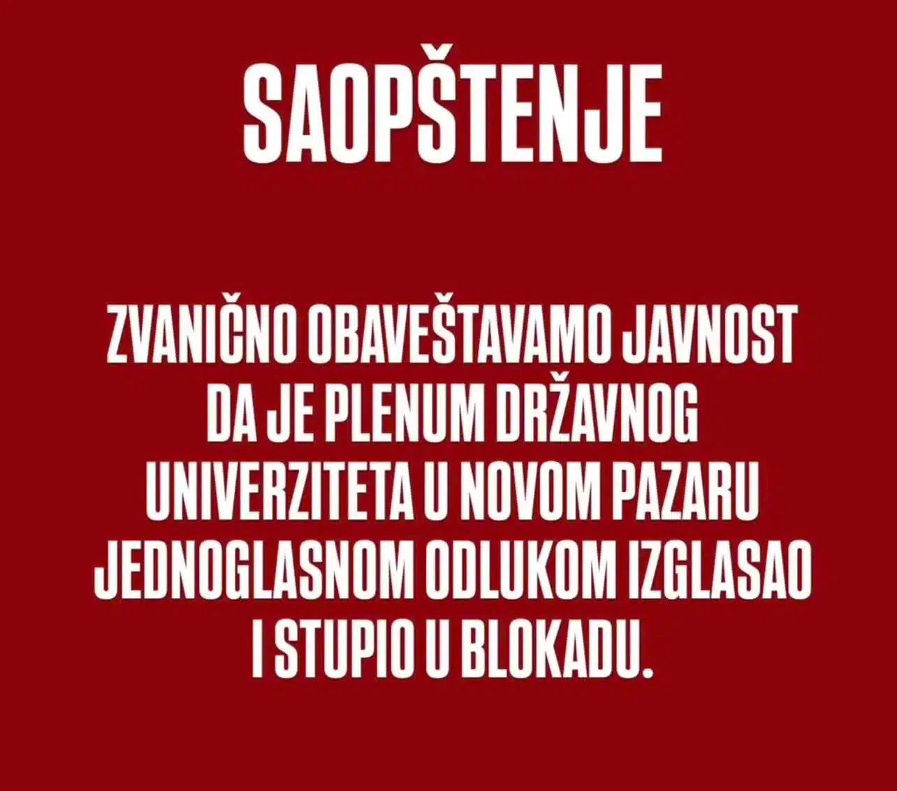 Plenum Državnog univerziteta u Novom Pazaru jednoglasno je izglasao stupanje u blokadu. Studenti poručuju da će biti u blokadi od danas pa do daljnjeg, sve dok se njihovi zahtevi ne ispune.