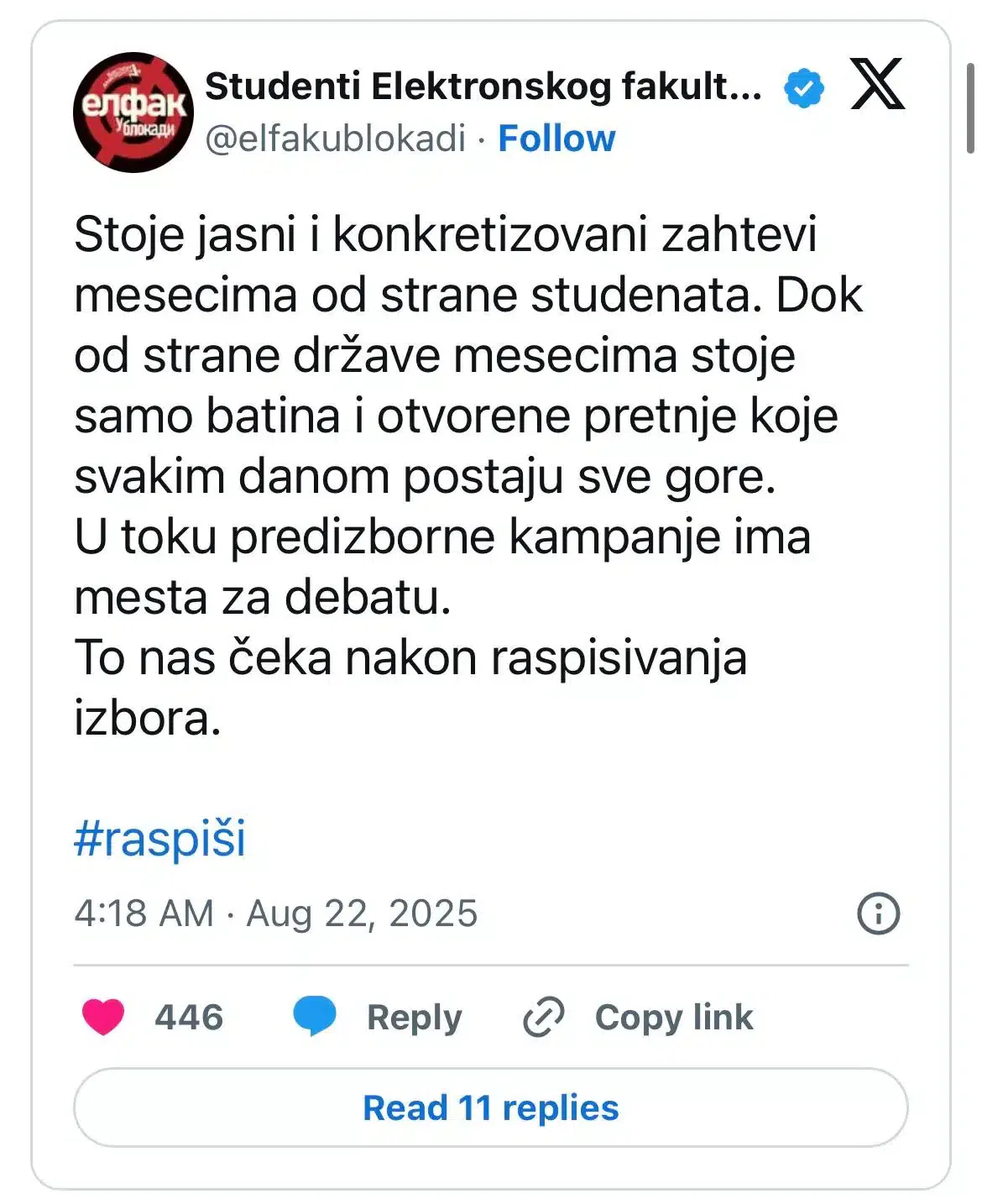 Studenti Elektronskog fakulteta podsetili su da već mesecima stoje njihovi jasni i konkretizovani zahtevi, dok od strane države stižu, kako navode, samo „batina i otvorene pretnje“.