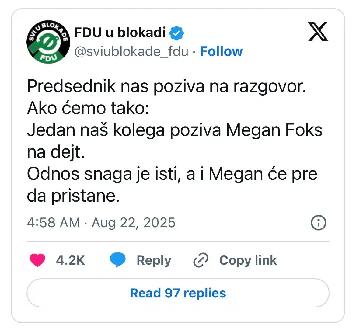Na mreži su se oglasili i drugi fakulteti. Sa Fakulteta dramskih umetnosti poručili su da je Vučićev poziv na razgovor sličan „pozivu jednog njihovog kolege Megan Foks na dejt“, ocenjujući da je „odnos snaga isti, a da bi Megan pre pristala“.