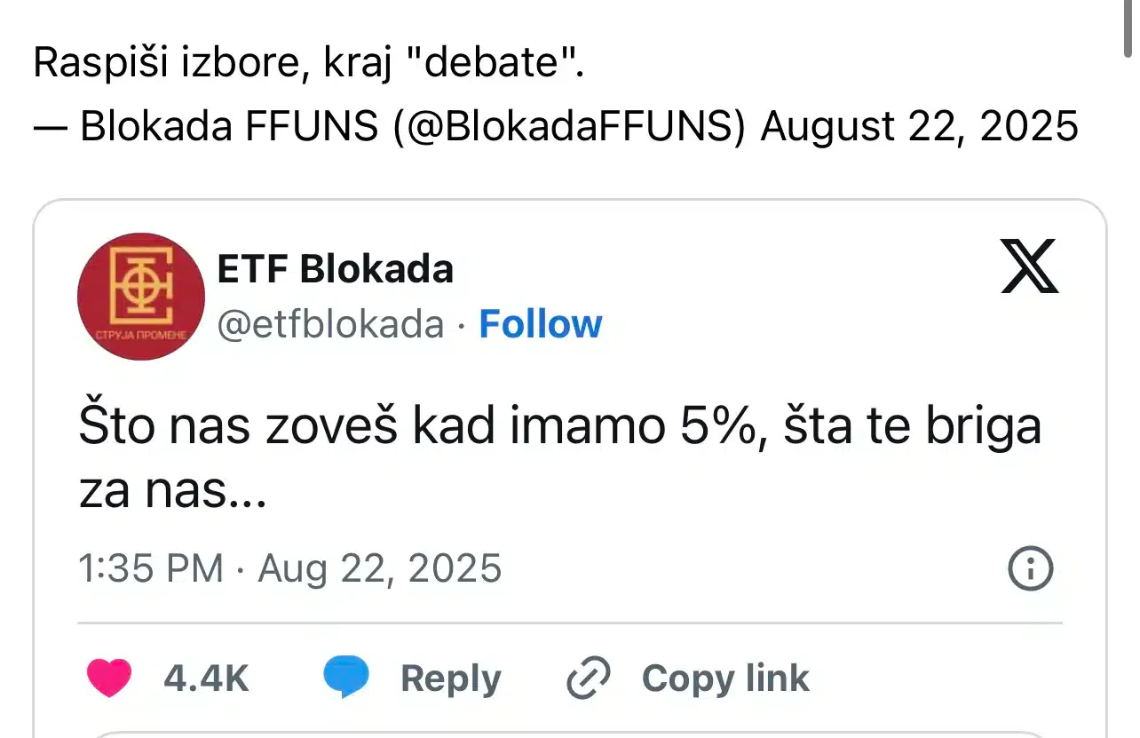 Pravni fakultet u blokadi kratko je odgovorio sa „Raspši izbore! Nemamo o čemu drugom da pričamo“, dok su studenti ETF-a poručili: „Što nas zoveš kad imamo 5%, šta te briga za nas…“