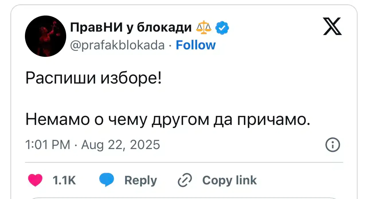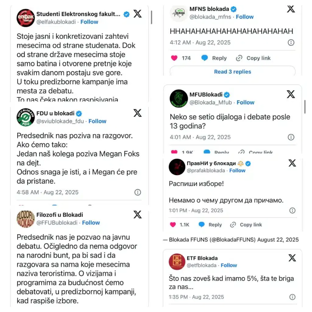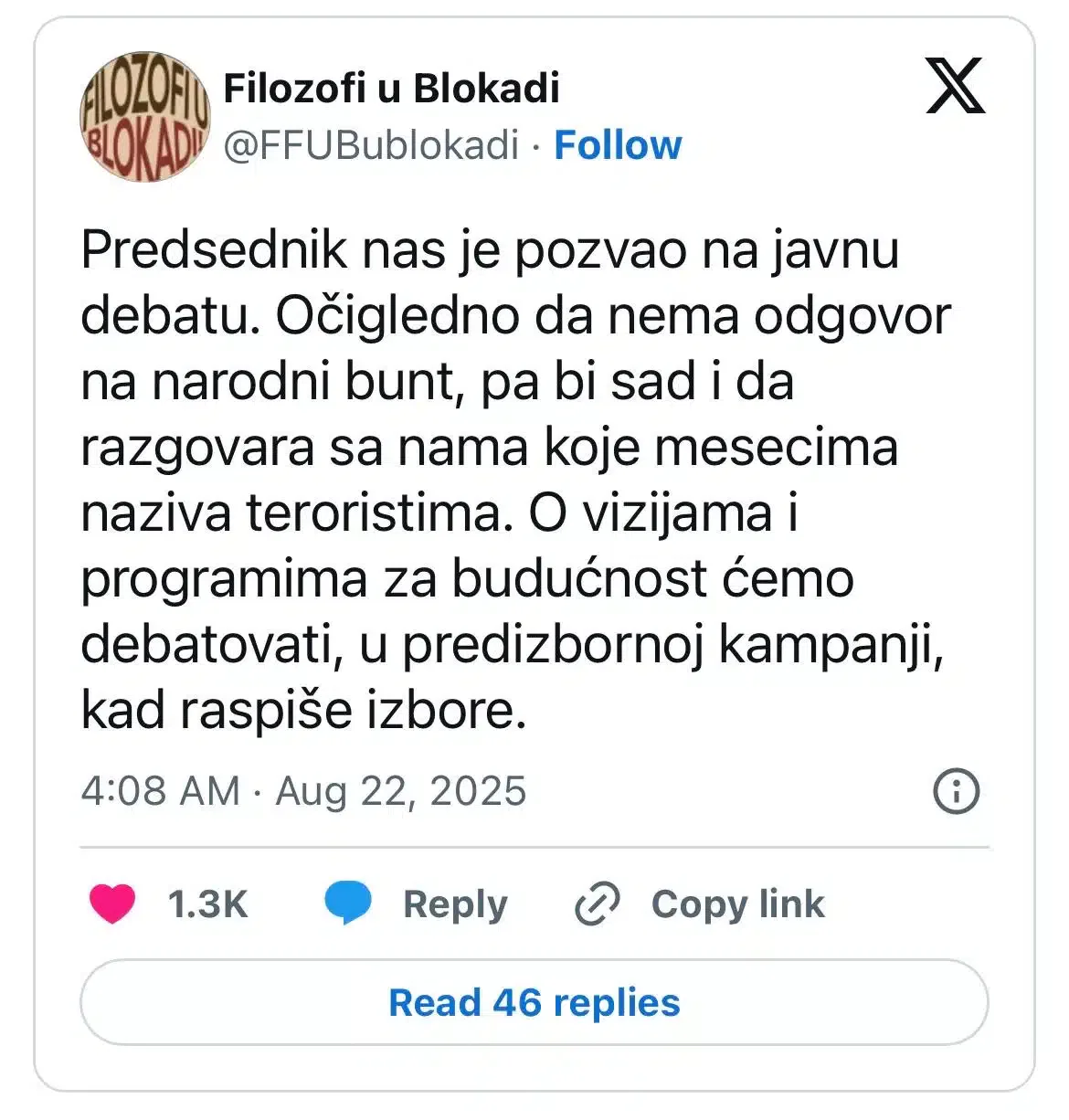 „Predsednik nas je pozvao na javnu debatu. Očigledno da nema odgovor na narodni bunt, pa bi sad i da razgovara s nama koje mesecima naziva teroristima. O vizijama i programima za budućnost ćemo debatovati, u predizbornoj kampanji, kad raspiše izbore“, poručili su studenti Filozofskog fakulteta u blokadi.
