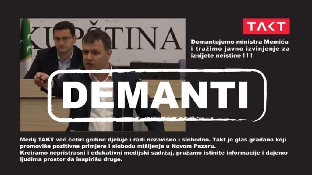 “Takvo ponašanje, kao i postupak ministra Memića, predstavljaju jasan pokazatelj da, umesto podrške, slobodni mediji u Novom Pazaru trpe diskriminaciju i razne pritiske”, saopštili su iz “Takta” uz poziv Memiću da im se javno izvini.