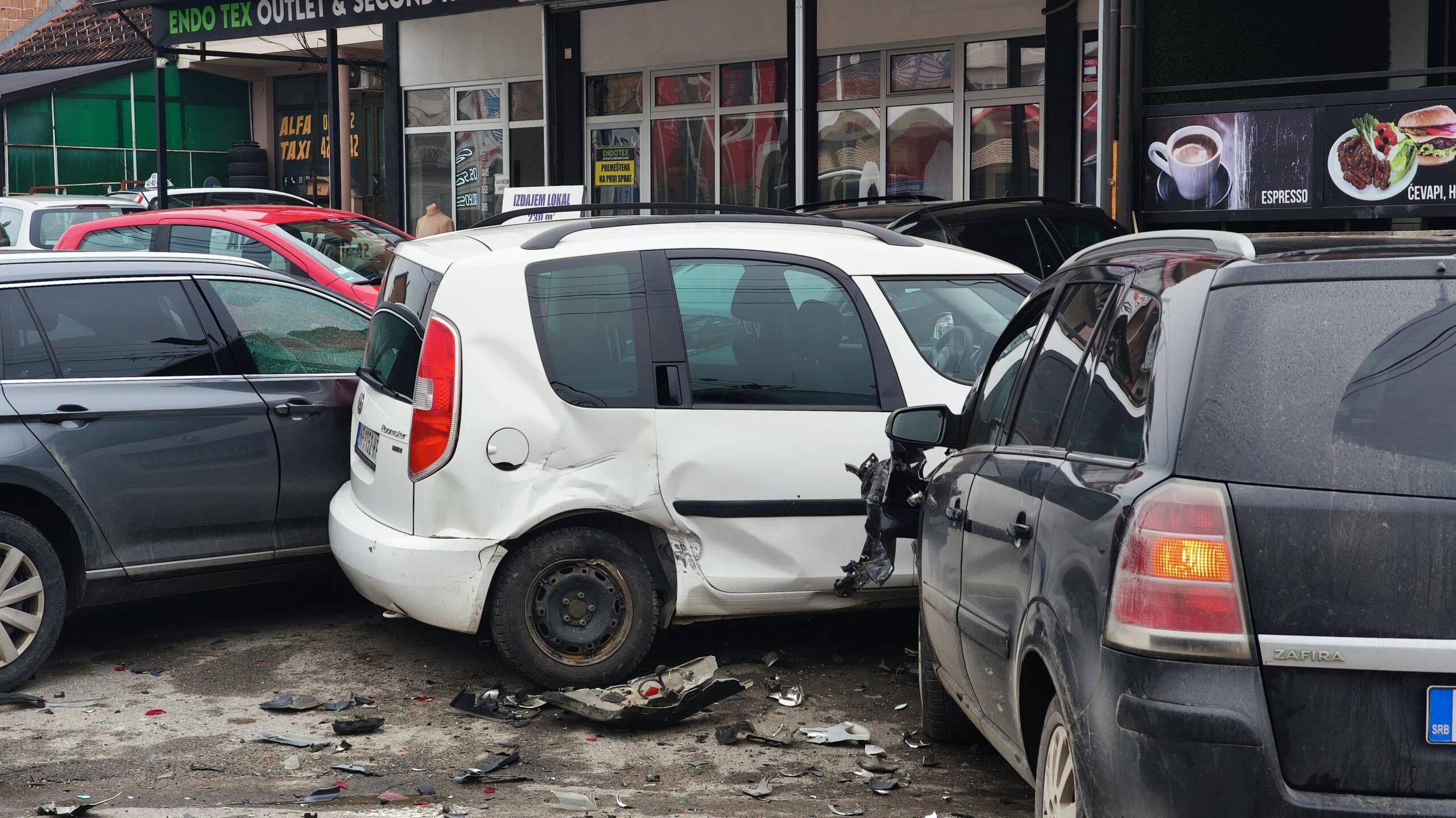 Do sudara je došlo kada je jedno vozilo izašlo na put, drugo je pokušalo da ga zaobiđe i udarilo u kolonu parkiranih automobila ispred lokalnog objekta.