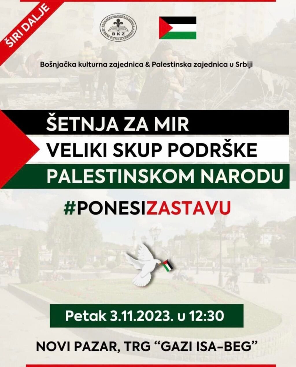 Treći skup podrške palestinskom narodu u Novom Pazaru organizovaće Bošnjačka kulturna zajednica i Palestinska zajednica u Srbiji. Šetnja za mir održaće se danas, u petak 3. novembra sa početkom u 12 i 30 časova na trgu Gazi Isa-bega.