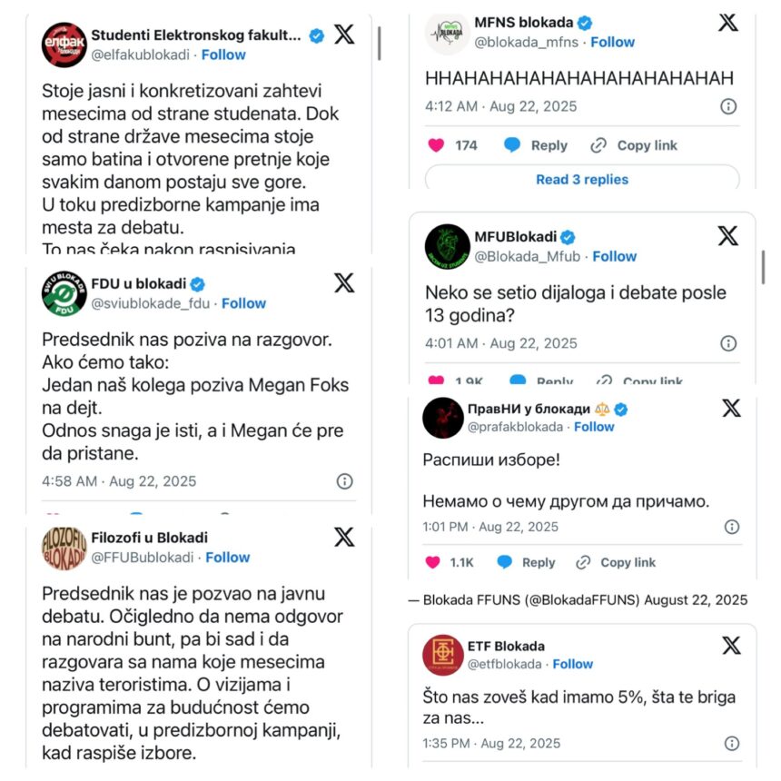 Studenti više fakulteta, koji su već mesecima u blokadi, odgovorili su predsedniku Srbije Aleksandru Vučiću na njegov poziv na javnu debatu i poručili da će razgovarati s njim tek u…