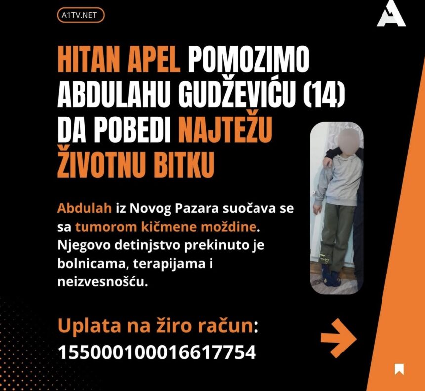 Četrnaestogodišnji Abdulah Gudžević iz Novog Pazara suočava se sa najtežom životnom borbom – dijagnostikovan mu je tumor kičmene moždine. Njegovo detinjstvo, koje je trebalo da bude ispunjeno igrom, školom i…